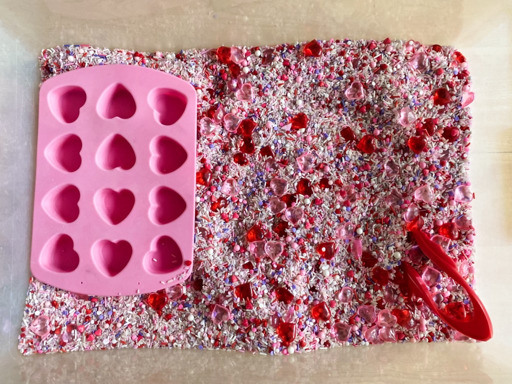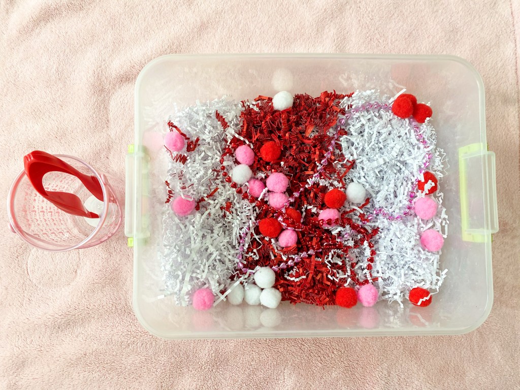 Rice Box Play—Hands down our littles favorite box filler. Also the messiest. LOL. Balance, right? Question is… have you ever put your hand in a big bag or container of raw rice?? It actually is SO soothing. If you haven’t ever done it, I encourage you to try it and let it fall through your fingers. We love a good theme box, so we have so many bags full of themed rice at this point. I grabbed the rice bag, and dumped it in the bin. I added a container of festive valentines sprinkles, and added in some heart gems. A crowd pleaser, for sure!