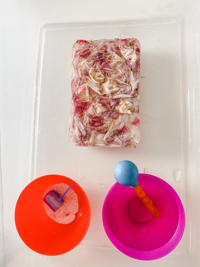 I use this one for the valentines day flowers that are starting to frump over. Instead of tossing them in the trash, have your littles help you pull all of the petals off of the flowers. (Hello, perfect fine motor activity in itself!) Then put those flowers in a Tupperware dish with some water (add some food coloring if desired), and put it in the freezer overnight for a fun activity the next day. Once frozen, you can put the block of frozen flower petals in a bin or tray, add some bowls of warm water and salt to help your littles thaw out, or “free,” the petals.