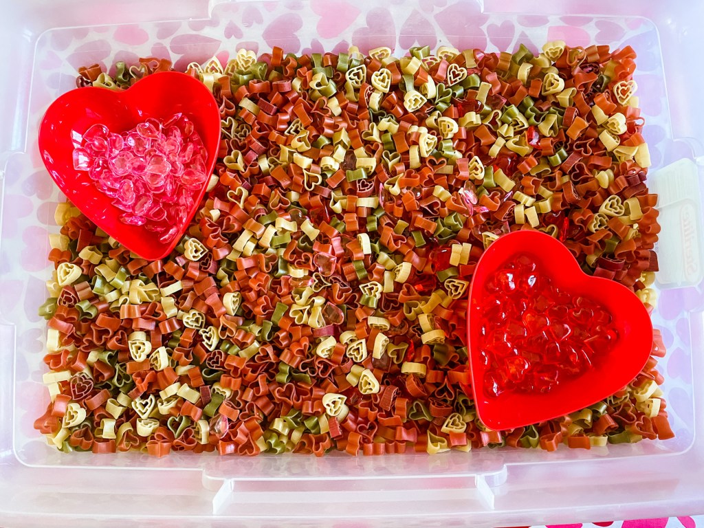 Dried Noodle Play—These fun noodles I found at Homegoods, and then found some new ones at ALDI this year. I found these on amazon, too! So perfect, and such a fun sensory box filler! We added little heart gems to jazz up the box. You can find those here. This box I feel comfortable letting my 18m old explore with. To expand on this sensory play, you could easily add some pipe cleaners or string to make bracelets or jewelry. You can even have your little one sort the different heart noodles by color. The possibilities are endless.