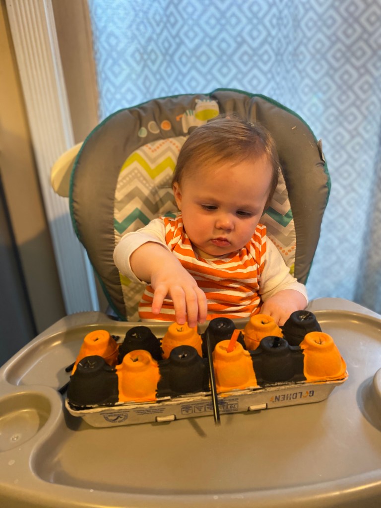 Fine Motor Straw Match: This DIY was just as easy as can be. I had orange and black straws leftover from a halloween party, and so I painted the bottom of an egg carton, and clipped some straws for some fun matching. Now my little girl is a little young to match the colors perfectly, but she enjoyed poking and pulling the straws through the little holes!