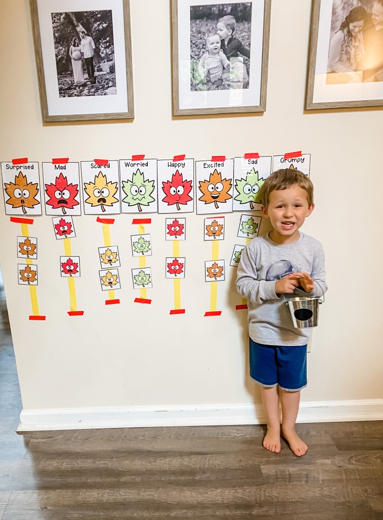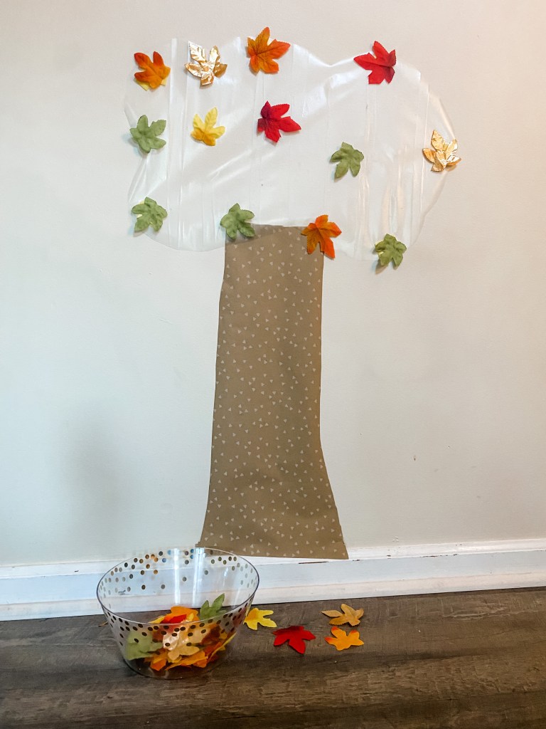 Some faux leaves, contact paper, and painters tape! The leaves stick to the contact paper and “fall” when they lose their stick. My kids enjoyed “raking” them when they blew away from the bowl or fell down from the tree–or sticking them back up!
