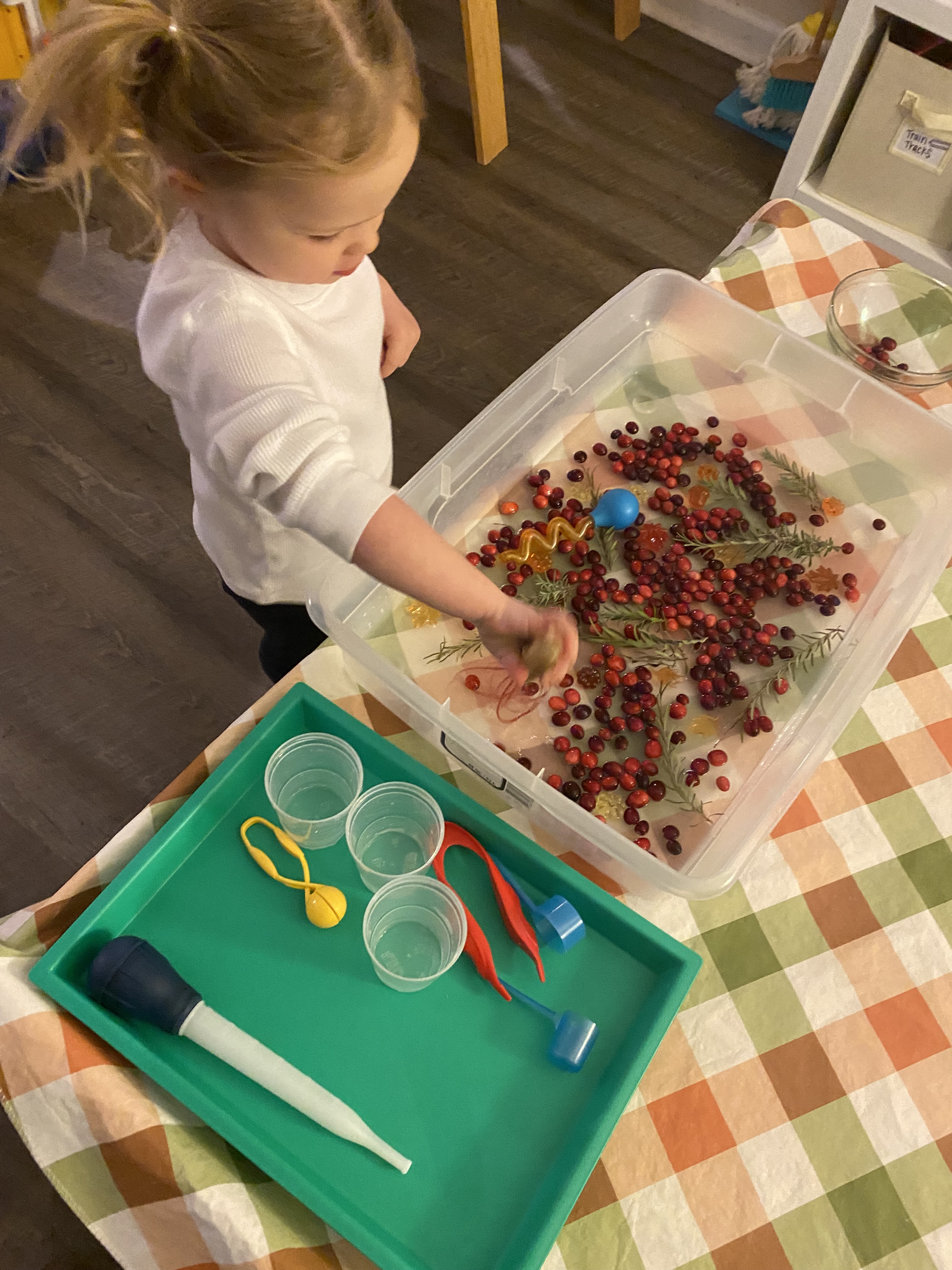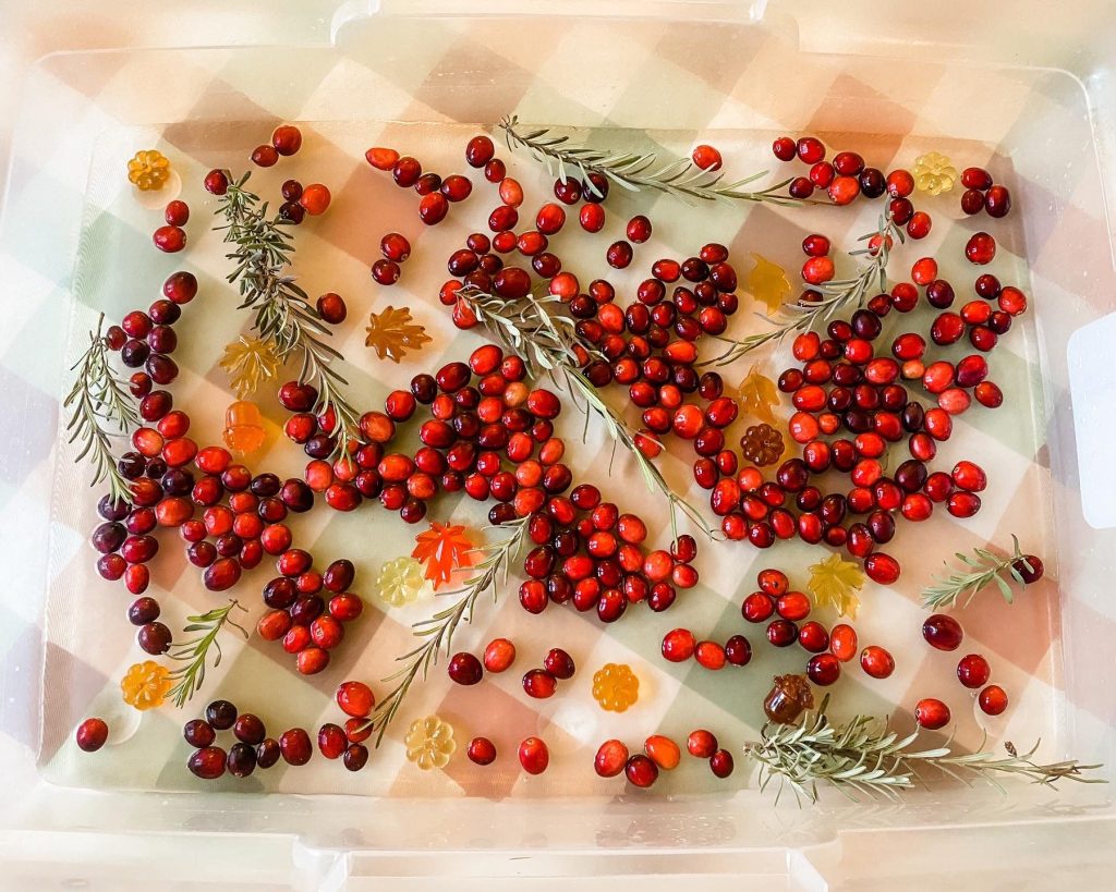 Below you’ll see one of our favorites, which is just water, cranberries, and a few sprigs of Rosemary. This is perfect after Halloween, as you’re transitioning into the Thanksgiving season! I can’t tell you enough, this is so easy, and so fun for littles. There’s something resetting in the brain when playing with water. Hence why littles usually love bath time so much!