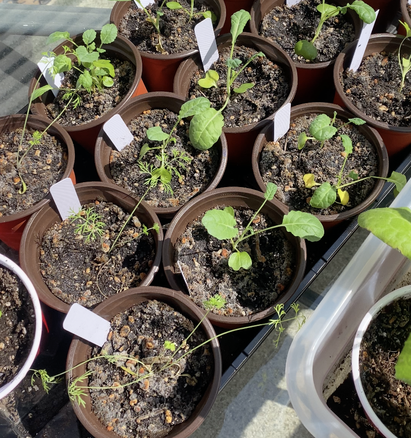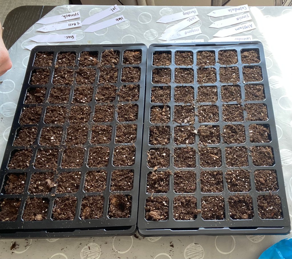 Once your pots are full, the fun begins. In order to guarantee successful germination of each type of seed, I plant a row of each kind of seed I am going to plant. Make sure you are labeling EACH cell, or you’ll run into forgetting which plant is which variety. I promise, there will be forgetting if you don’t… lol. I sometimes wait until I have transferred them into bigger pots. I plant at least two seeds (if they are tiny) in each cell. Once they germinate and a set of leaves develop, you’ll pull or separate them. I will go more into this later.