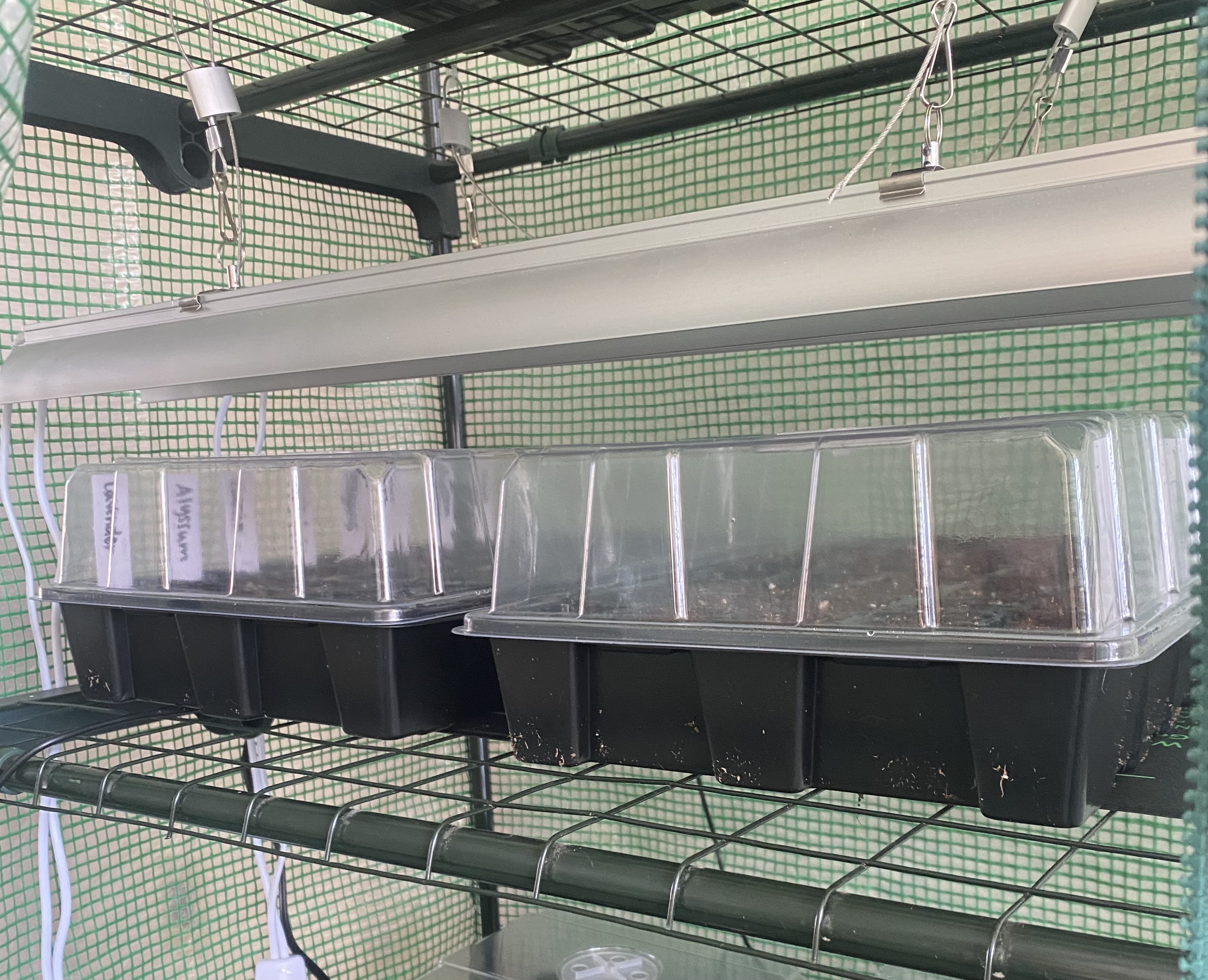 Greenhouse or Shelves — either will work. In the past I’ve used wired shelves set up in my dining room, which has the most natural light. However, this year, I set up my greenhouse in hopes my 18m old won’t destroy all the seed babies. Fingers crossed.