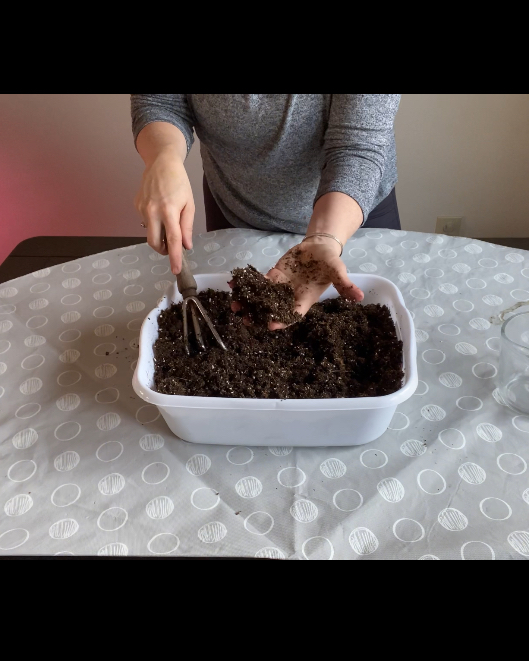 Once your supplies are all set up and ready, it’s time to get your soil ready to be put in the trays. Over the years I have learned that when planting in any kind of container it is important that the soil be a little wet. Not soaking, not damp, wet enough to make a clump when grabbing a fist full and giving it a squeeze. I like to use a big bin and put some soil in with a splash of water and mix it all around with a fork (or your hands), before scooping it into the trays or pots.